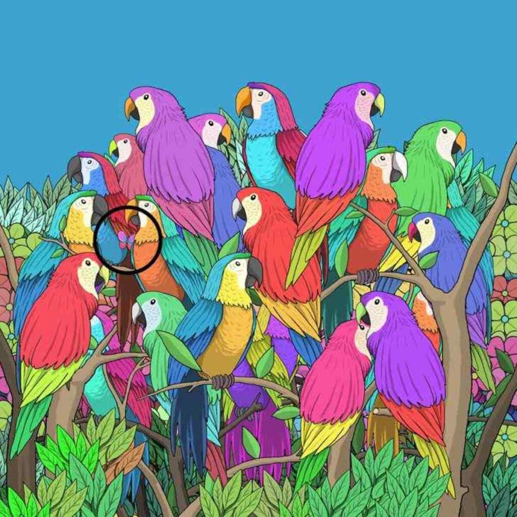 לנוחותכם, הדגשנו את הפרפר המוסתר בתמונה למטה: הפרפר מתחבא בין שני תוכים בצד שמאל של התמונה. נטען שאם הצלחתם לזהות את הפרפר המוסתר בין התוכים בתוך 7 שניות, זה עשוי להעיד על אינטליגנציה יוצאת דופן. מחקרים גילו שככל שמתאמצים יותר המוח בפתרון פאזלים קשים, כך נוטים להיות חכמים יותר.