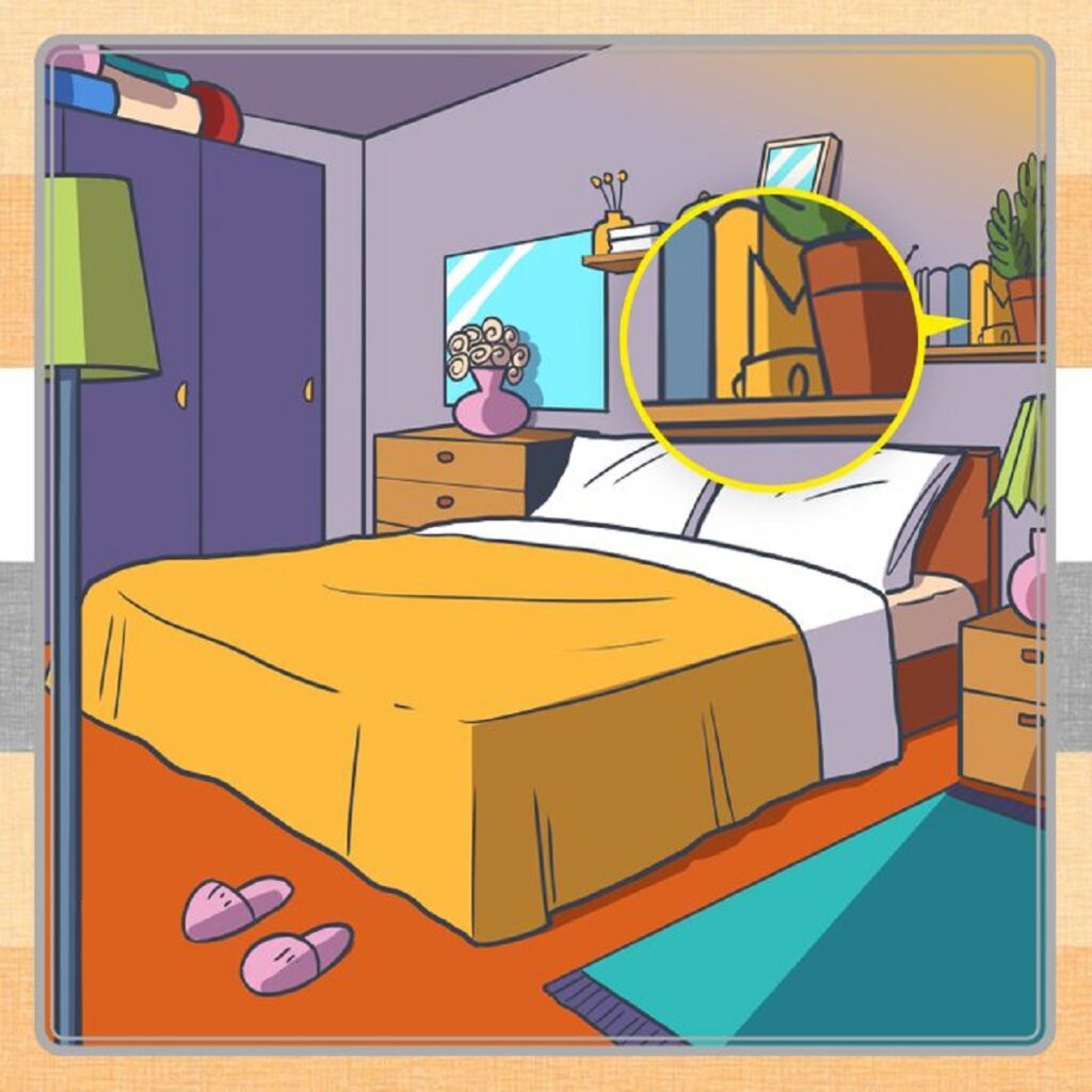 אם התקשית לזהות את הכתר המוסתר, אנחנו כאן לעזור! אם תתבונן היטב בתמונה, תראה חדר שינה שבו המיטה מסודרת. נעלי בית מונחות על הרצפה מול המיטה. בתוך החדר יש ארון, ארוניות צד ומדפים על הקירות. חפצים רבים מונחים בתוך החדר על המדפים, בארון ועל הארוניות. אשליה אופטית זו של חדר שינה יכולה לגלות עד כמה הראייה שלך חדה באמת.