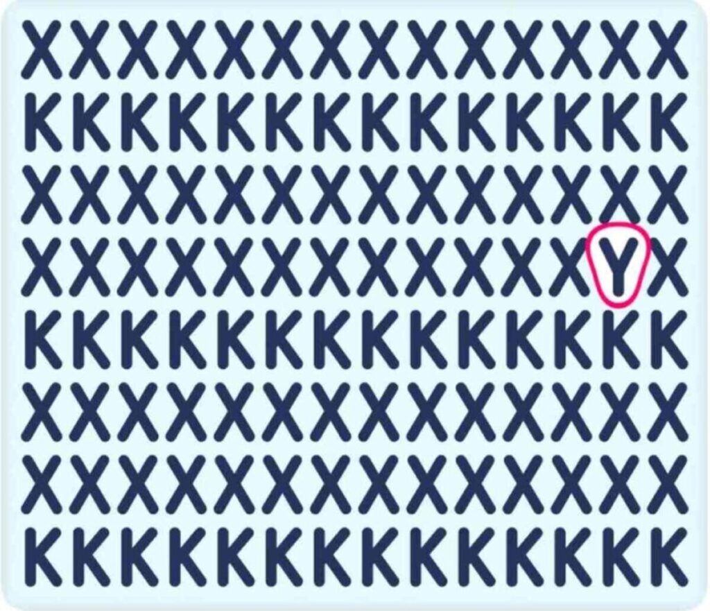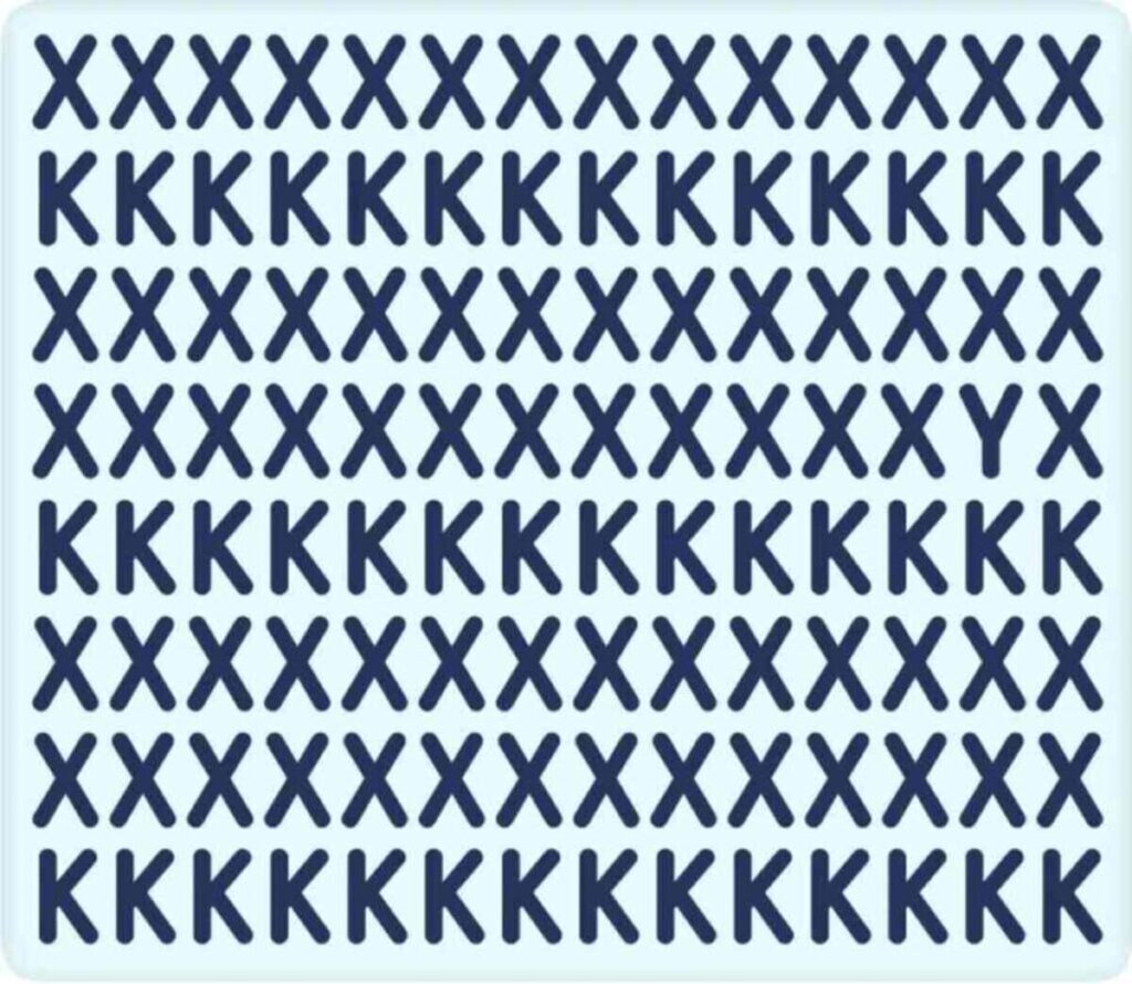 המשימה שלכם היא למצוא את ה-Y בין ה-X ל-K בתמונה שמופיעה למטה. מדובר באתגר תצפיתי שדורש ריכוז ומהירות, אבל העניין הוא לא רק לסיים מהר – מדובר גם בכיף ובדרך לשפר את המהירות והדיוק של ההתבוננות שלנו.