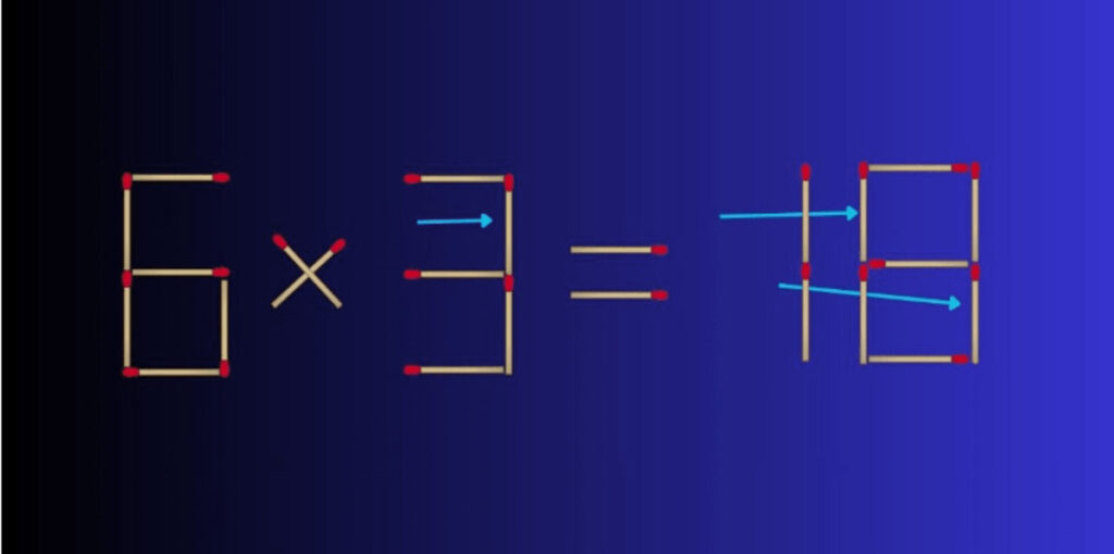 הפתרון לחידה הוא: להזיז שלושה גפרורים כדי להפוך את המשוואה ל-6×3=18. פשוט, נכון? רק כשיש לכם את התשובה! האם נהניתם מהחידה הזו? כמה זמן לקח לכם לפתור אותה? אם אתם גאים בהישג שלכם, למה לא לשתף את המאמר הזה ברשתות החברתיות?