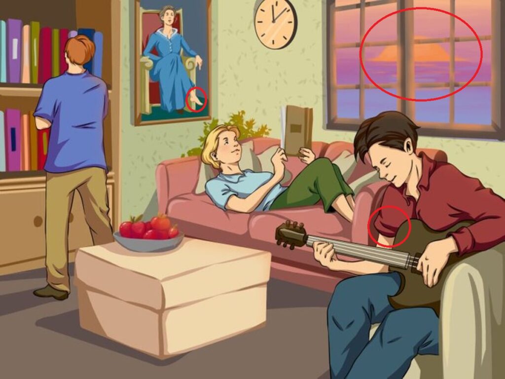 בתמונה שלפניכם, עליכם לזהות שלוש טעויות שמתחבאות בתוך תמונה של סלון החברים. בתוך התמונה, אפשר לראות חבר אחד שמביט בספרים על המדף, חבר שני קורא ספר בזמן שהוא שוכב על הספה, והחבר השלישי מנגן בגיטרה בזמן שהוא יושב על הספה. אבל האם הצלחתם לזהות את שלוש הטעויות בתמונה?