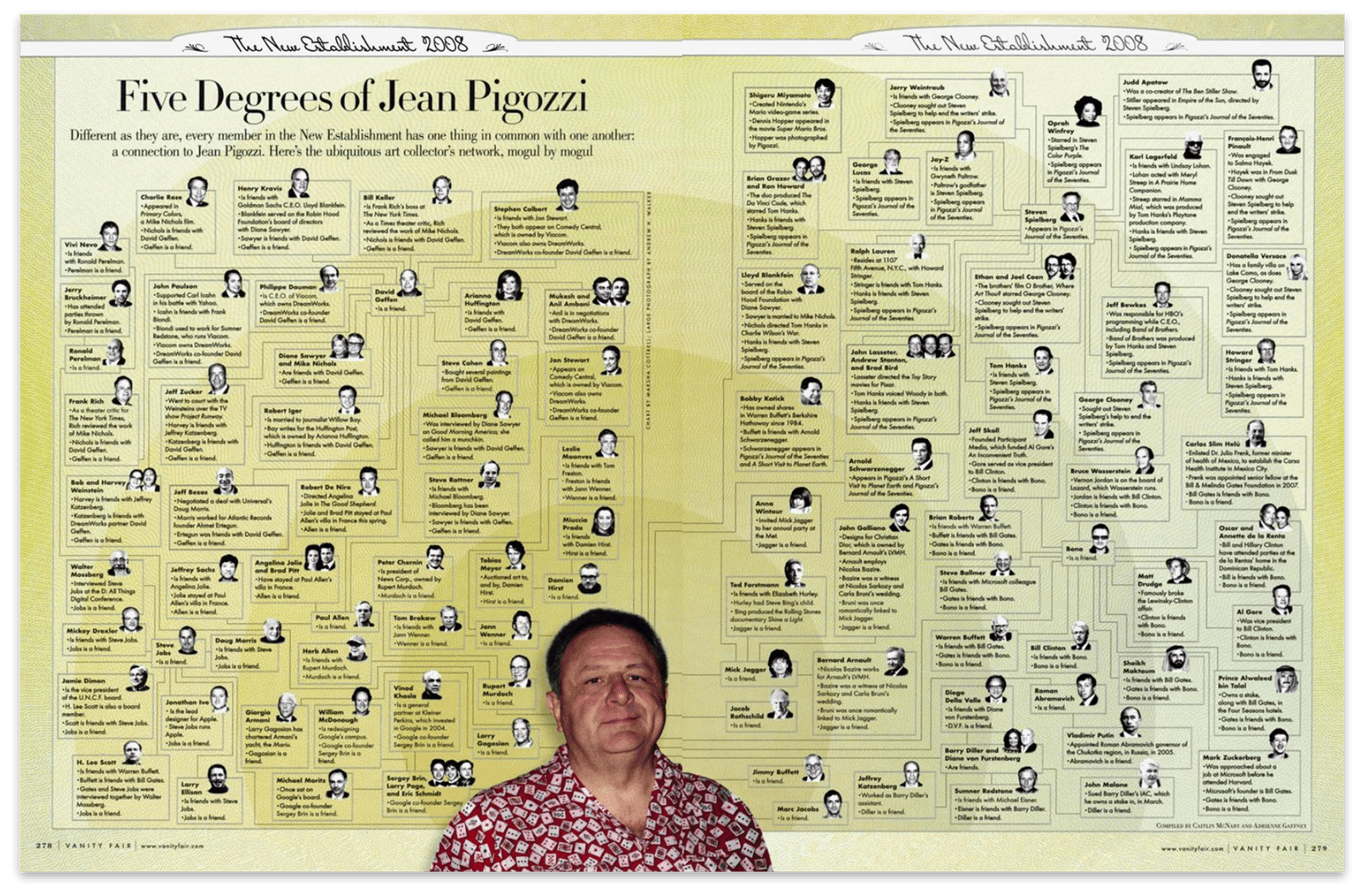 התרגול עשוי להיות נכון ואולי לא. אבל אז, הרבה דברים בחייו של פיגוצי האיטלקי יליד צרפת נשמעים בלתי סבירים, מהיאכטות (הוא מספר סיפור על וודי אלן להיות "לא כל כך מאושר" בטיול בסן טרופז לפני כמה שנים, כשהם נתקלו במים סוערים) ובתים ברחבי העולם, מאות הנשים שהוא אומר שהוא יוצא איתם, לילות שמתלבשים בדראג איתן מיק ג'אגר ומכה את העיר, מסיבות על מסיבות על מסיבות (הוא היה א יריד הבל עמוד התווך של מסיבת אוסקר לאורך עשרות השנים), רכישות אמנות אקסטרווגנטיות, חלקים סיביים בסרטים כמו שוד מגדל ו וול סטריט 2השקעות צופות פני עתיד בחברות טכנולוגיה — פיגוצי איכשהו מכיר את כולם, אבל אף אחד לא באמת מכיר אותו לעומק, כך נראה.