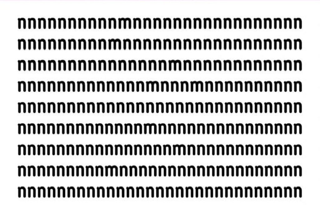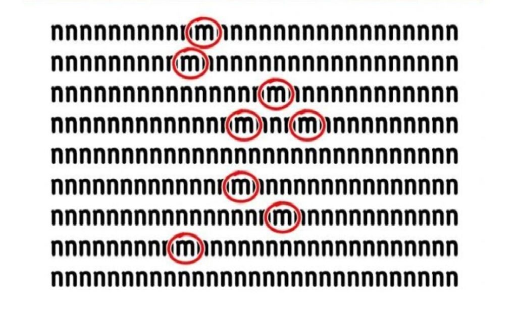 בתמונה הזו, עליכם לגלות את כל האותיות 'm' המוסתרות בין האותיות 'n'. ישנן 9 שורות של האות 'n', וכדי למצוא את כל ה-'m' תוך 11 שניות, עליכם לסרוק במהירות את כל השורות. כדי להקל עליכם, סימנו את האותיות 'm' בתמונה המצורפת: