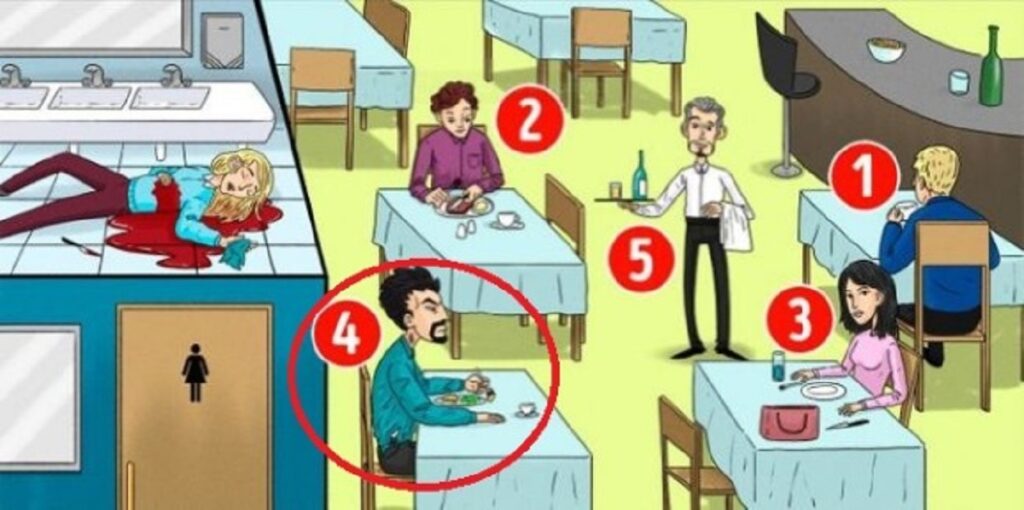 חידות מוח הן דרך מצוינת לבדוק את רמת ה-IQ שלך. בחידת מוח זו, תצטרך להשתמש בכישורי ניתוח והסקת מסקנות כדי לזהות את הרוצח מבין חמשת האנשים החשודים ברצח האישה במסעדה שבתמונה.