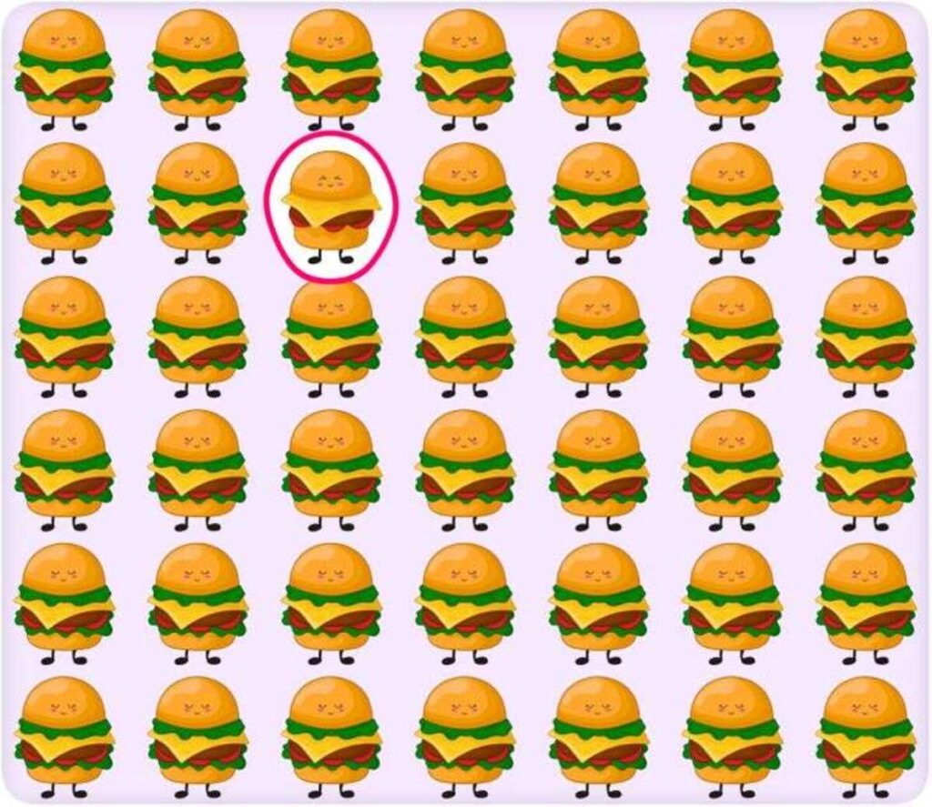 בחידת המוח הזו, עליך למצוא את הצ'יזבורגר השונה מקבוצת ההמבורגרים. ישנן 6 שורות ו-7 עמודות המלאות בצ'יזבורגרים דומים למראה. כדי למצוא את הצ'יזבורגר המוזר תוך 9 שניות, עליך להסתכל במהירות על כל השורות והעמודות.