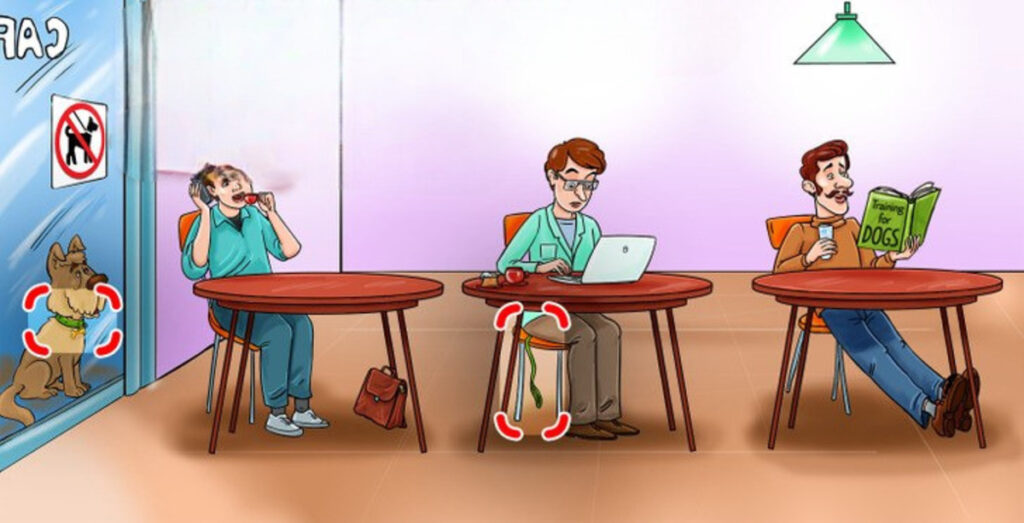 האדם הראשון יושב ליד החלון, שקוע בשיחת טלפון ונהנה מתה חם. השני, היושב במרכז, עובד על מחשב נייד. השלישי עמוק בקריאה בספר על אילוף כלבים. עם זאת, אם תתבוננו יותר לעומק, תגלו שהאדם היושב במרכז הוא זה שמחזיק ברצועת הכלב – הוא בעל הכלב.