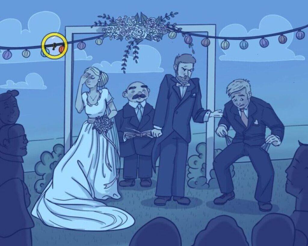 המשימה שלכם היא לעזור לחתן למצוא את טבעת הנישואין, שהיא מוסתרת היטב באשליה האופטית. בתמונה ניתן לראות את החתן, הכלה והכומר עומדים במסדרון החתונה. החתן מביט בזעם בכיוון של חברו הטוב, שנראה כי איבד את טבעת הנישואין. הטבעת מוסתרת באחד המקומות בתמונה, ותצטרכו להפעיל את כל החושים על מנת למצוא אותה בזמן. לפי האשליה, אם אתם מצליחים למצוא את הטבעת בתוך 9 שניות, סביר להניח שיש לכם אינטליגנציה גבוהה. כמובן, זהו מבחן כיף ומאתגר, אך אם אתם רוצים לדעת את רמת האינטליגנציה שלכם בצורה יותר מדויקת, כדאי לפנות למבחן IQ מקצועי².