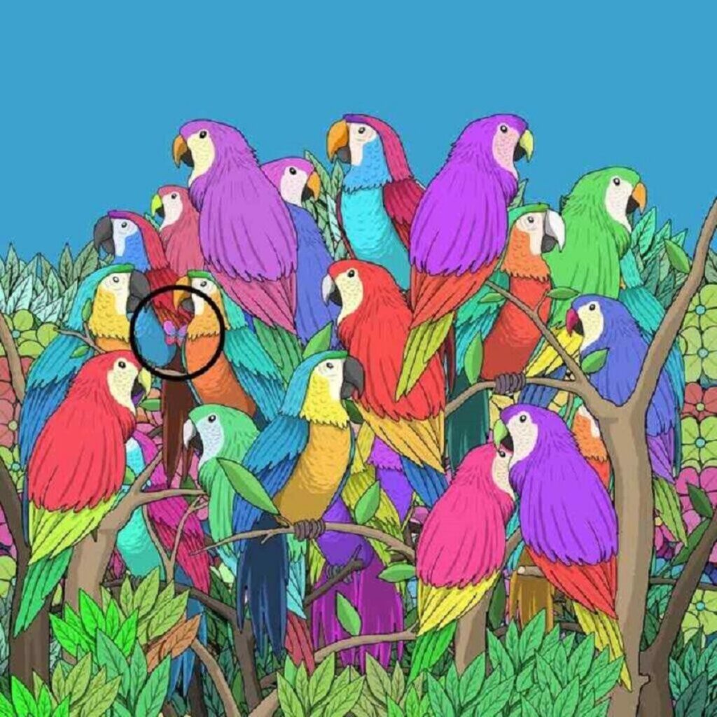 על התמונה שברשותכם מופיעים תוכים צבעוניים, ובין כל הדמויות הללו מסתתר פרפר קטן. המשימה היא לזהות את הפרפר בתוך המהומה. בפשטות, זה נראה כמשימה קלה, אך בפועל, עליכם לעבור על התמונה בצורה שיטתית ולחפש את הפרטים הלא שגרתיים. זמן החיפוש המומלץ הוא כ-11 שניות – אתגר שיאלץ אתכם להפעיל את חוש ההתבוננות שלכם בצורה יעילה【¹】.